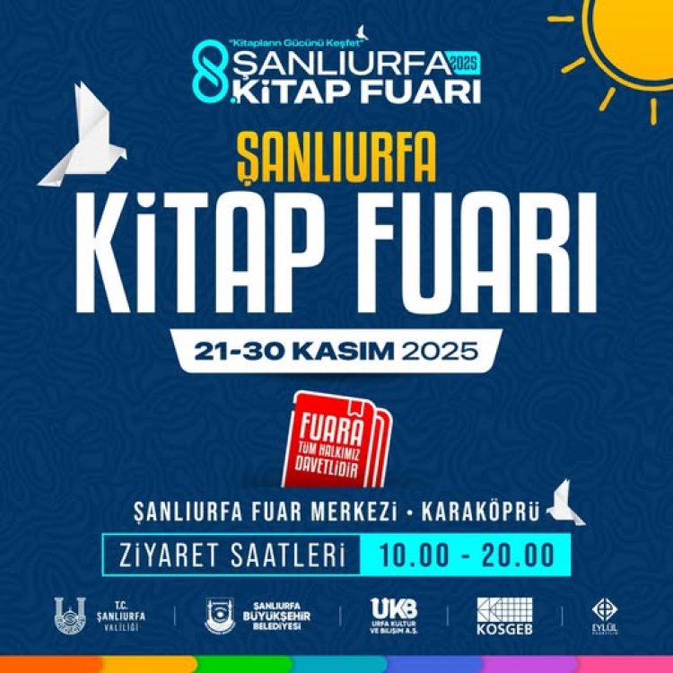 Şanlıurfa Valiliği, Büyükşehir Belediyesi ve KOSGEB'in destekleriyle düzenlenen 8. Şanlıurfa Ulusal Kitap Fuarı, 21-30 Kasım 2025 tarihleri arasında Karaköprü'deki Şanlıurfa Fuar Merkezi'nde kapılarını açıyor. Her gün saat 10.00-20.00 arasında ziyaretçilere açık olacak etkinlik, on gün boyunca edebiyatın büyüsünü bölgeye taşıyacak.