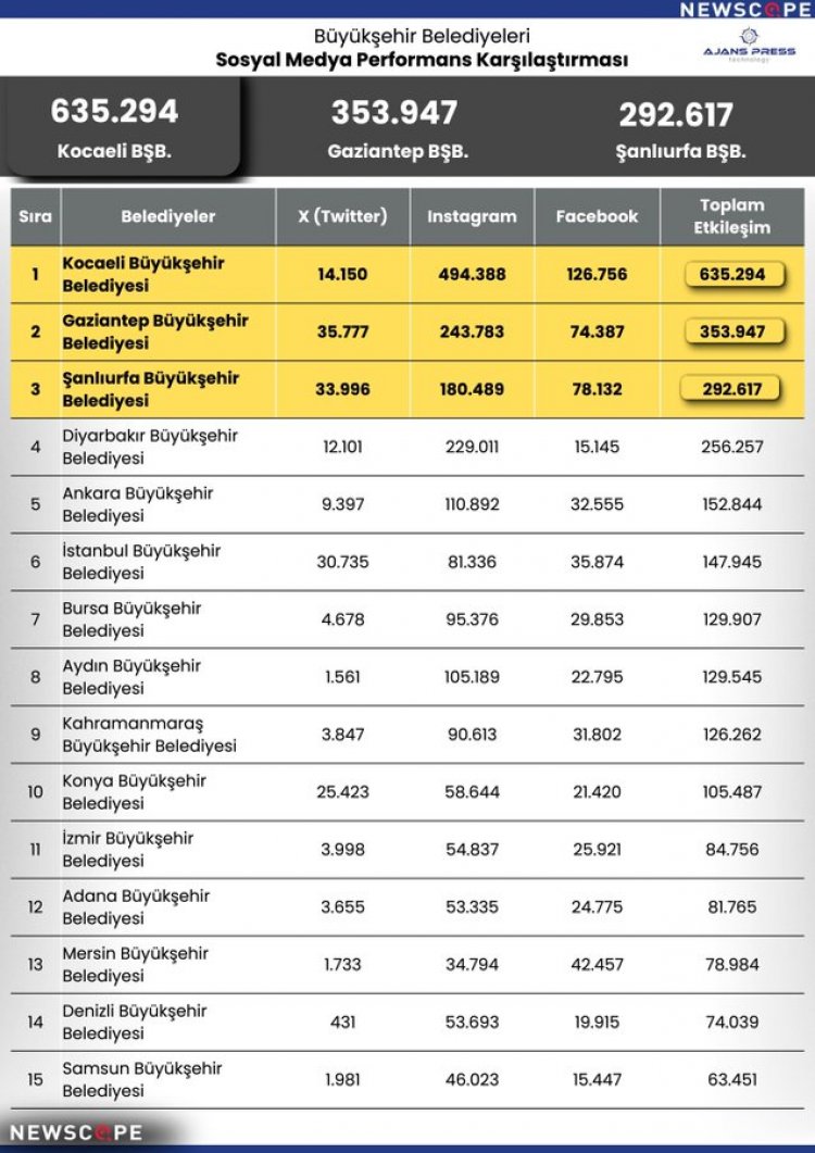 - Şanlıurfa, 292.617 toplam etkileşimle 3. sırayı hak etmiş; bu, belediyenin sosyal medya yönetiminde etkili bir strateji izlediğini kanıtlıyor.