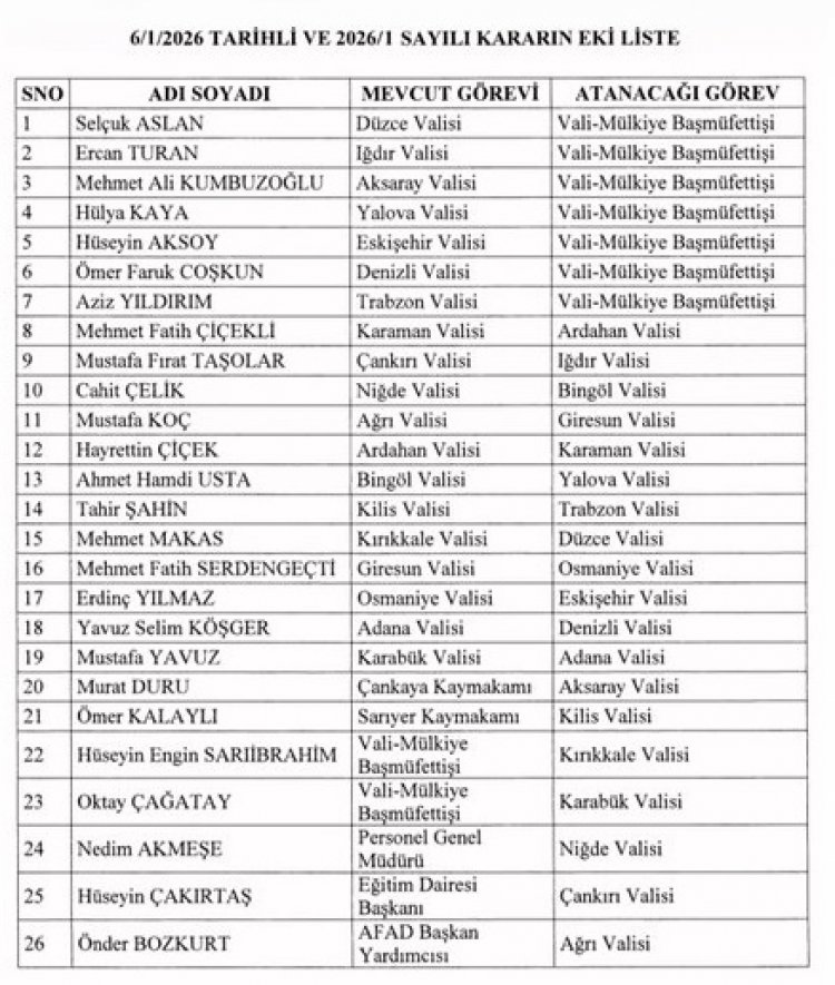Cumhurbaşkanı Recep Tayyip Erdoğan’ın imzasıyla yayımlanan Valiler Kararnamesi ile 26 ilin valisi ve üst düzey bürokratın görev yeri değişti. İçişleri Bakanı Ali Yerlikaya, atamaların "Türkiye Yüzyılı" vizyonu doğrultusunda idari yapıyı güçlendirme amacı taşıdığını belirtti.